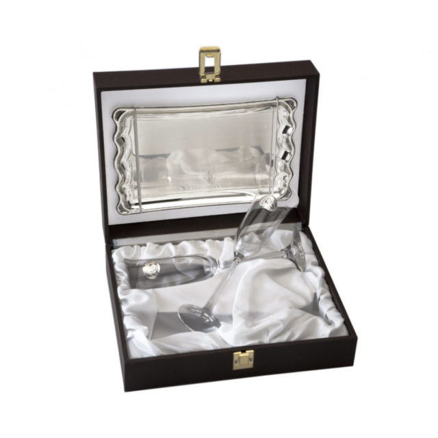 • Baúl de copas para bodas con bandeja y  de tela en blanco e incluye dos copas de cristal con chapa.