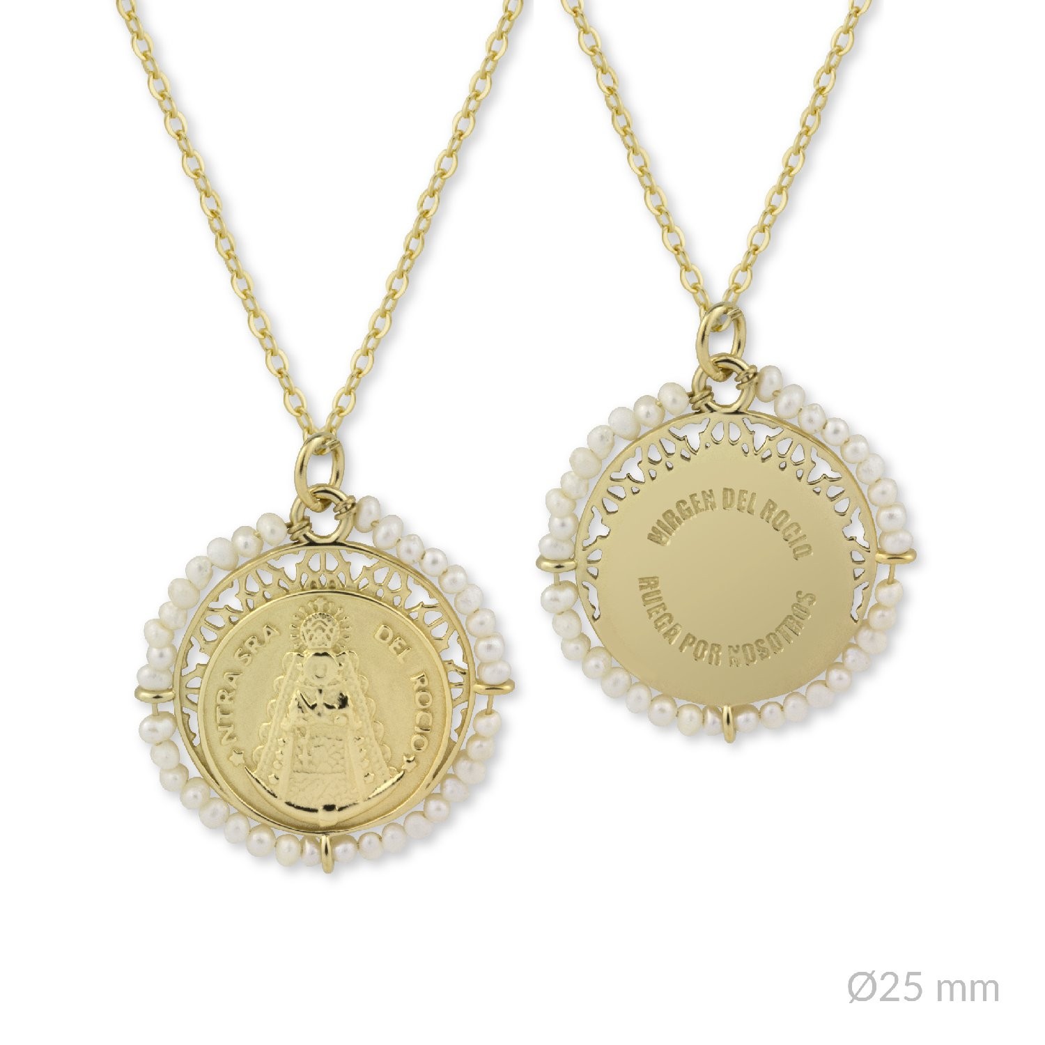 Delicada medalla cuyas perlas simbolizan la «Blanca Paloma» o la «Reina de las Marismas». El anverso podemos ver un exquisito relieve de la virgen con un acabado pulido que contrasta con el fondo mate arenado, aportando un contraste que resalta la imagen. En el reverso, tenemos en bajorelieve el texto «Virgen del Rocío. Ruega por nosotros».